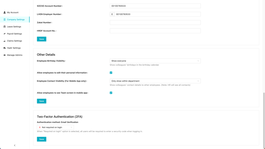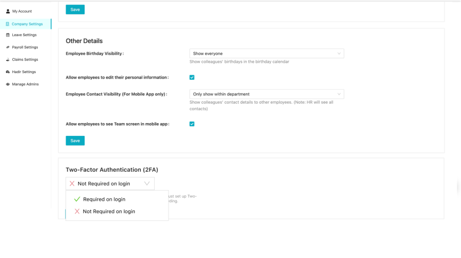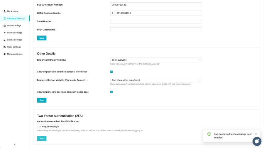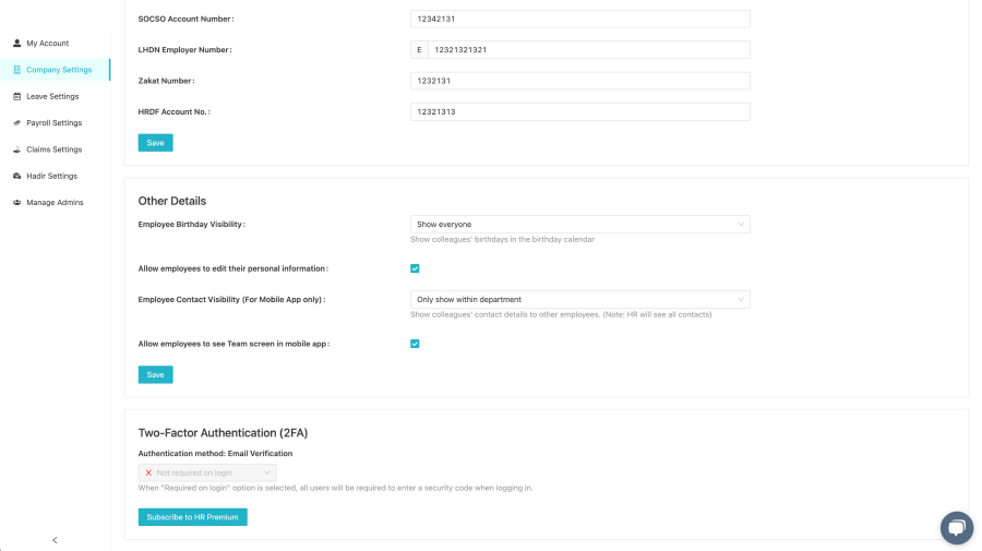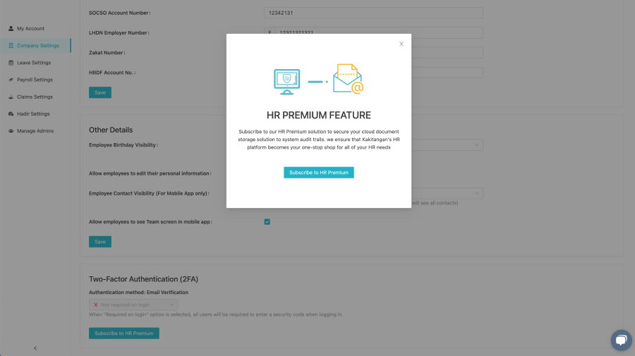 - Once Subscribe to the HR Premium, the admin are able to access the 2FA feature