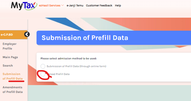 Dibawah ezHasil Services, tekan butang e-C.P.8D, dibawah Submission of Prefill Data, klik Upload Prefill.