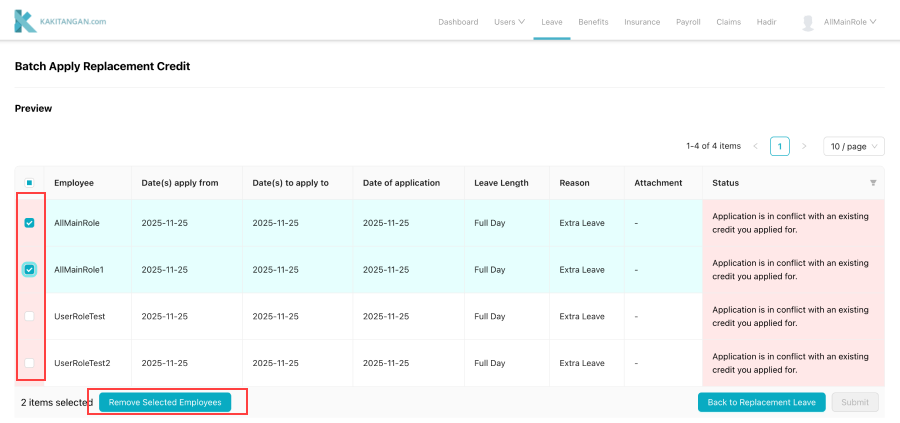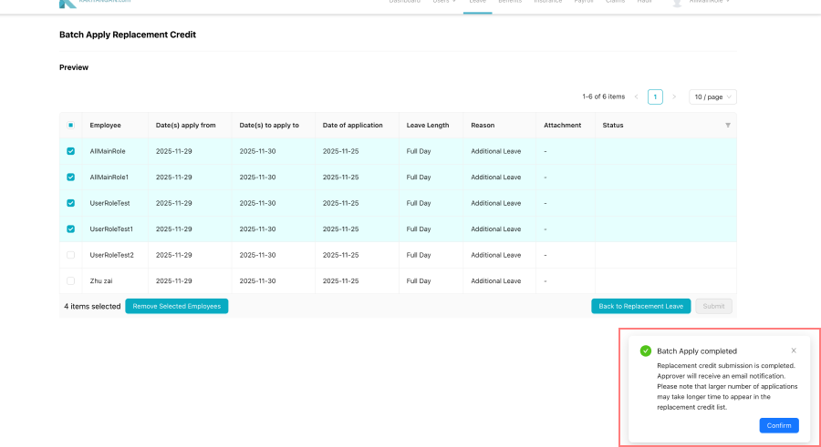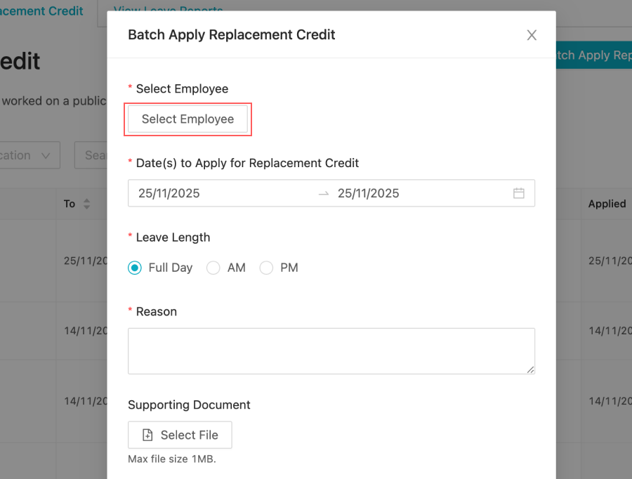 This features allows HR admins to add replacement credit for multiple employees at once. Instead of repeating the same update for each staff member, you can now submit in bulk and let the system handle the heavy lifting.