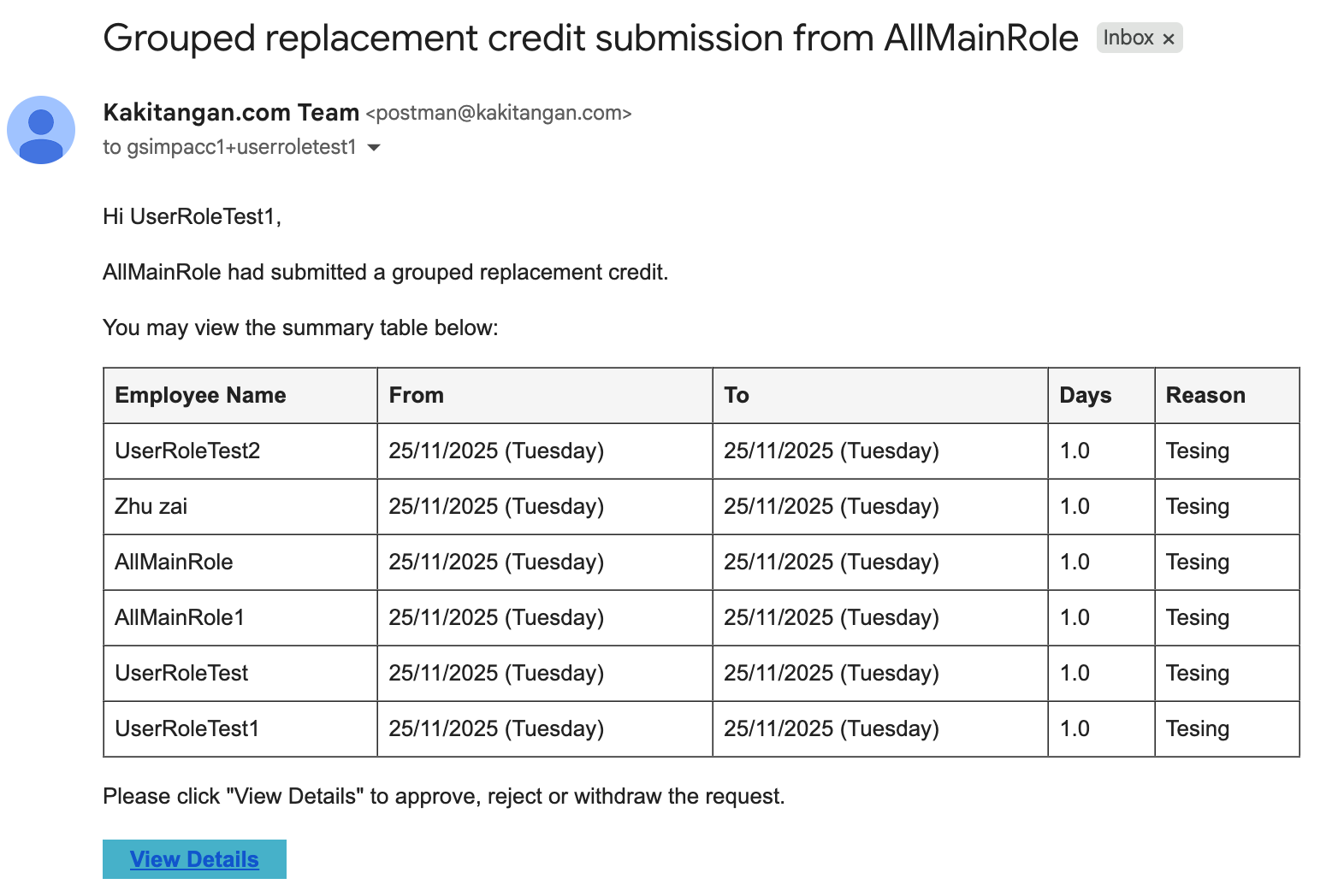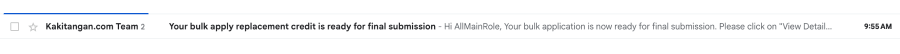 - After successfully submit, you will also receive an email regards about the bulk replacement credit is successfully submitted and will send an email to the approvers.