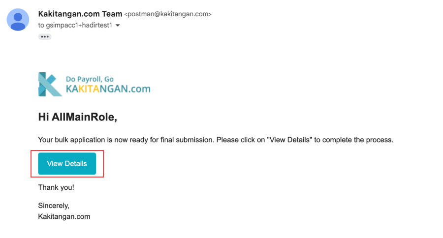 - Once submit, you will receive an email where the bulk application is now ready for final submission. Click `view details` to complete the process.