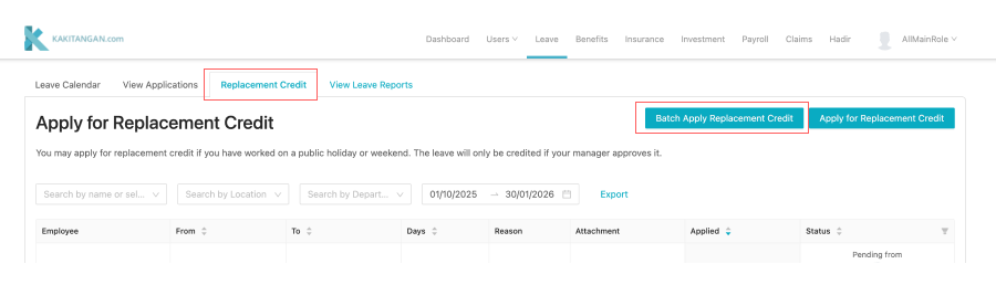 - Go to Leave -> Replacement Credit -> Batch Apply Replacement Credit