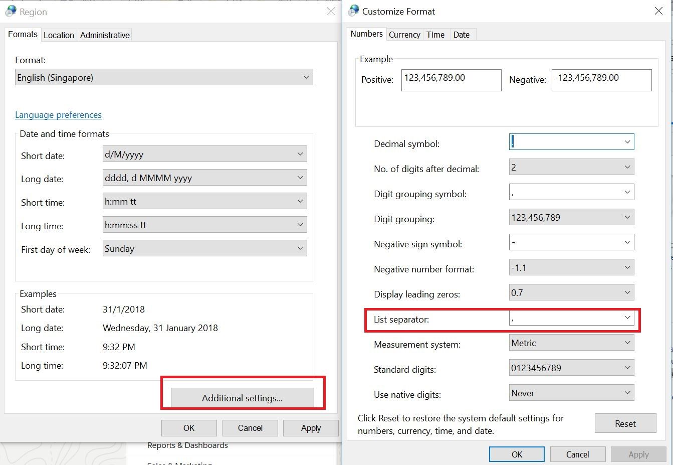 You can also click on Additional settings and change the decimal symbol to a dot and the list separator to a comma, without changing your region.