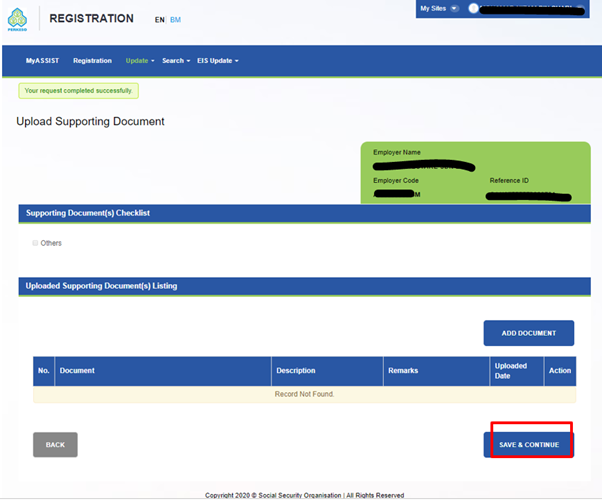 7. Di sebelah kiri atas, ada mesej menunjukkan ‘permohanan anda telah berjaya’ (request completed successfully), selepas itu tekan ‘Simpan dan teruskan’ (Save & Continue)