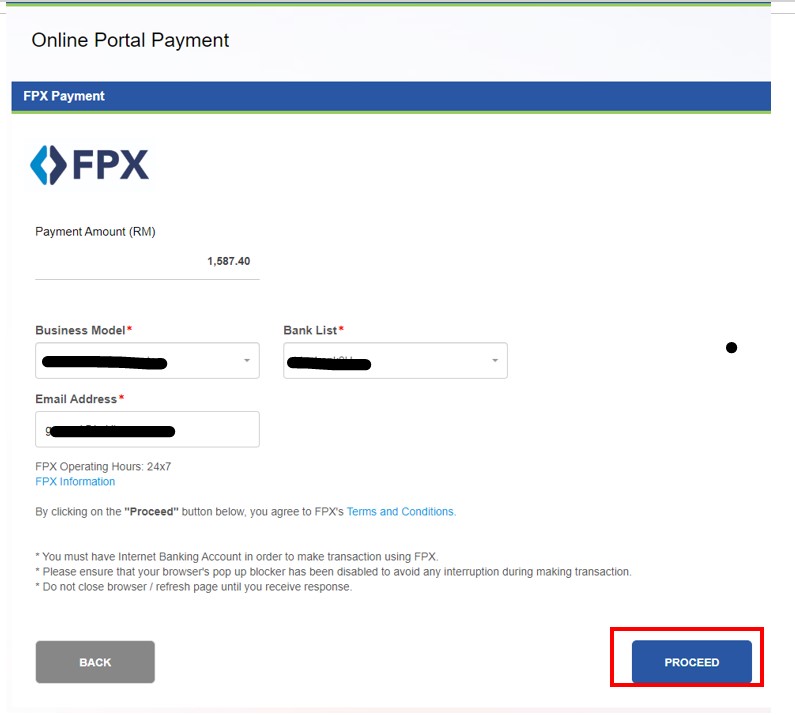 Sila isi butiran untuk pembayaran melalui FPX. Tekan Proceed setelah butiran diisi.