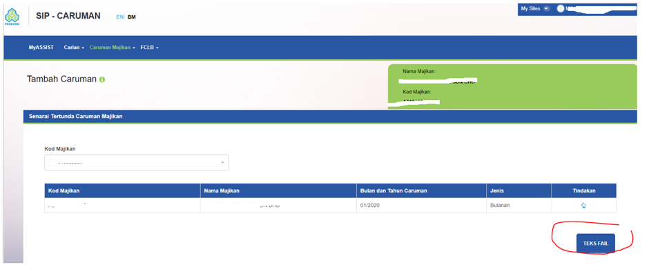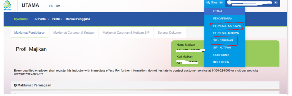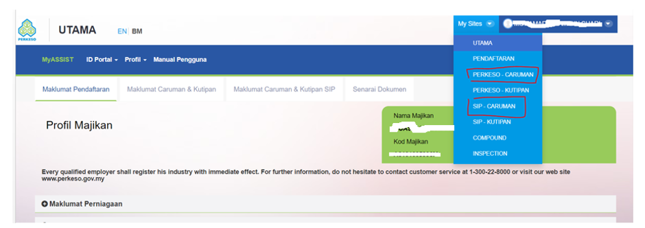- Tekan My Sites, pilih Perkeso - Caruman.
