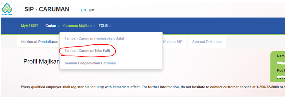 - Pilih Caruman Majikan dan tekan pada Tambah Caruman (Teks Fail)