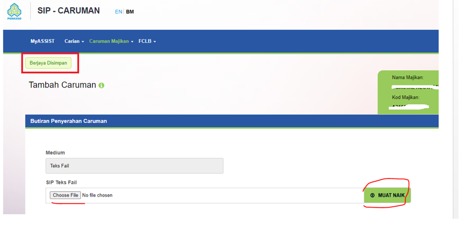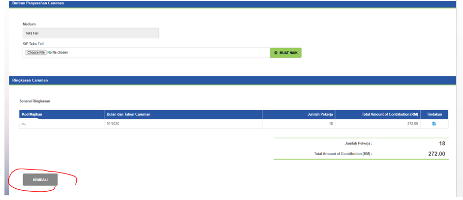 Setelah berjaya memuat naik, mesej Berjaya disimpan akan keluar dan tekan pada Kembali sekiranya jumlah yang di paparkan adalah betul.