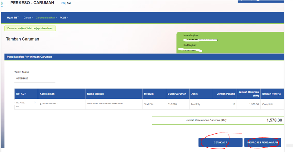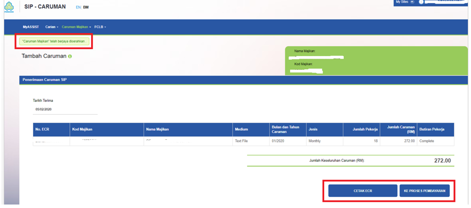 Di sebelah kiri atas anda akan menunjukkan Caruman Majikan telah berjaya diserahkan. Di sarankan untuk Cetak ECR sebagai rujukan dan tekan Ke proses pembayaran