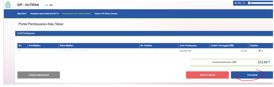 Seterusnya, sila periksa semula jumlah yang ingin di bayar dan tekan Teruskan