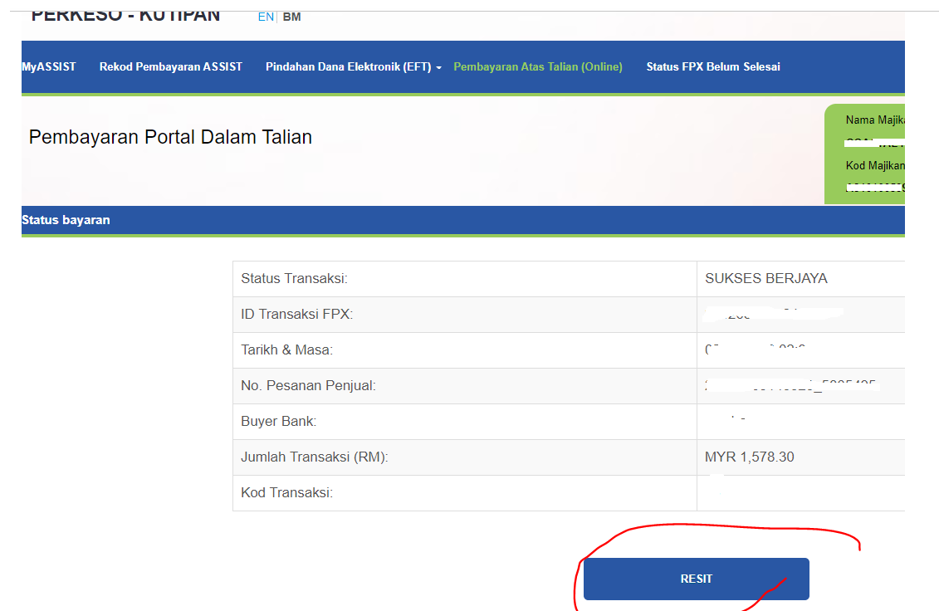 Anda akan kembali ke portal Assist dan paparan ini menunjukkan pembayaran anda telah berjaya dan anda boleh memuat turun resit pembayaran.