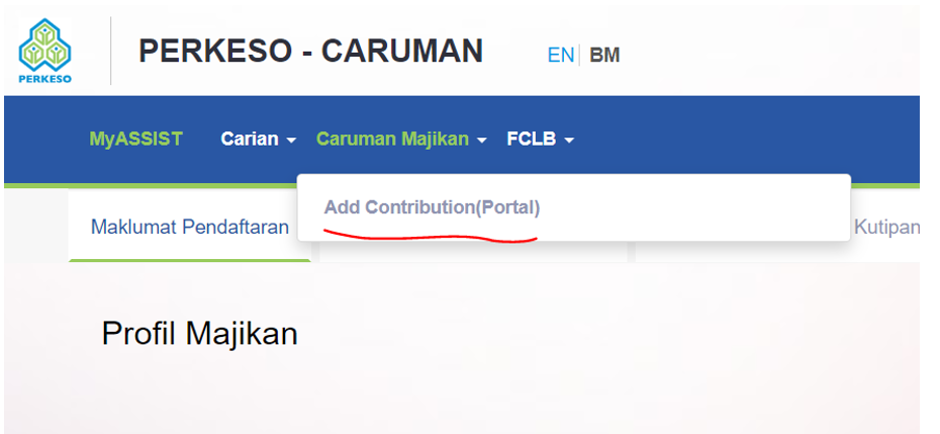 - Tekan Caruman Majikan dan pilih Add Contribution.