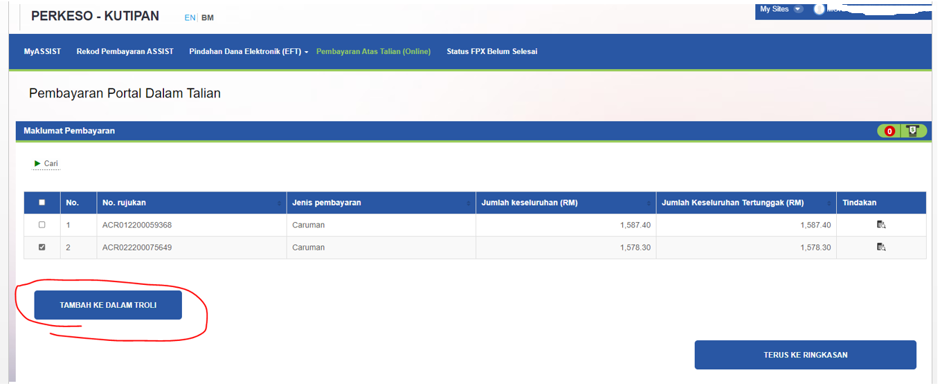 Langkah-langkah untuk pembayaran SOCSO melalui Portal Assist Perkeso.