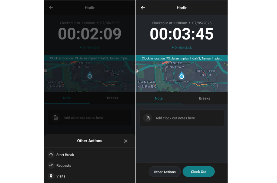 This is the main page of Hadir clock-in, if you have been assigned to several shifts, you can tap on each shift to see the details before select to clock-in for Normal or Overtime.