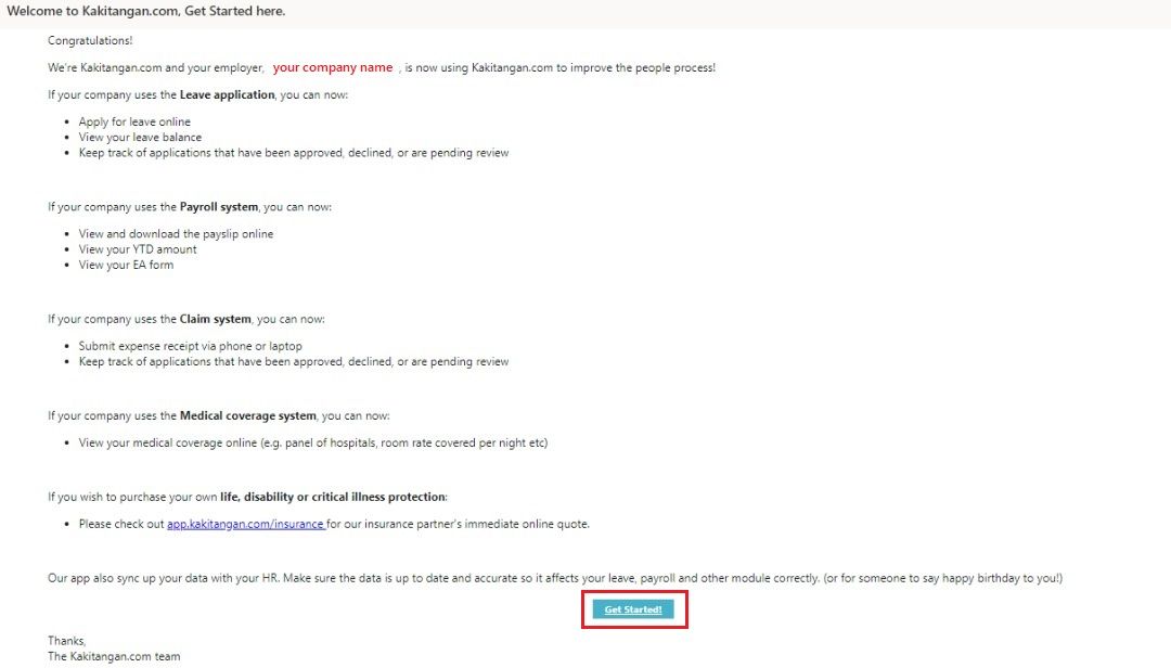 Firstly, you will receive an invitation email to start your journey at Kakitangan.com. Click Get Started.