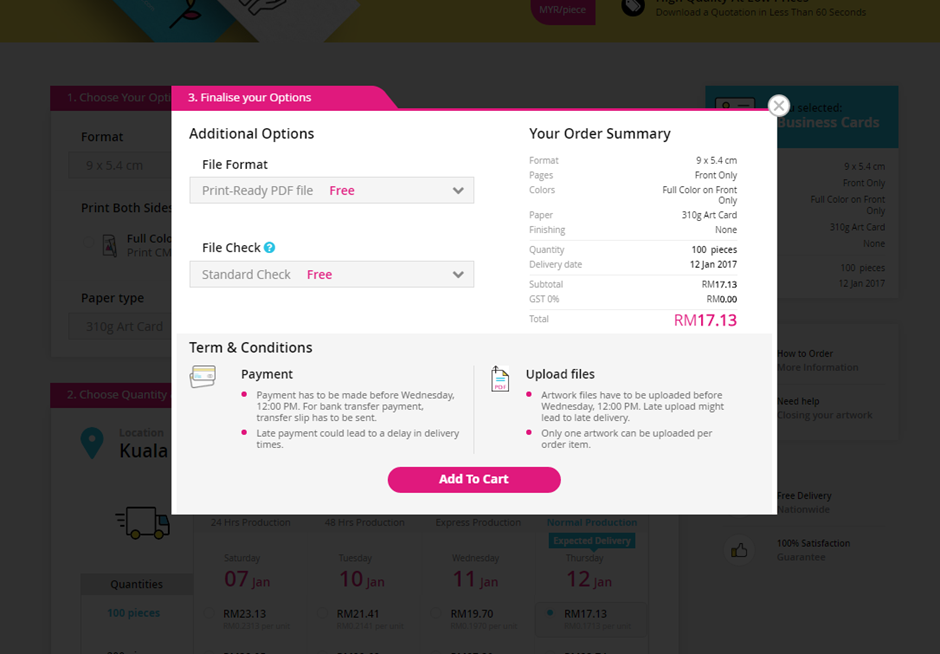 To “add to cart” the product (in the quantity and production speed that you desire), you just need to click inside the price table. That will open a pop-up window with a couple of final options before adding to cart.