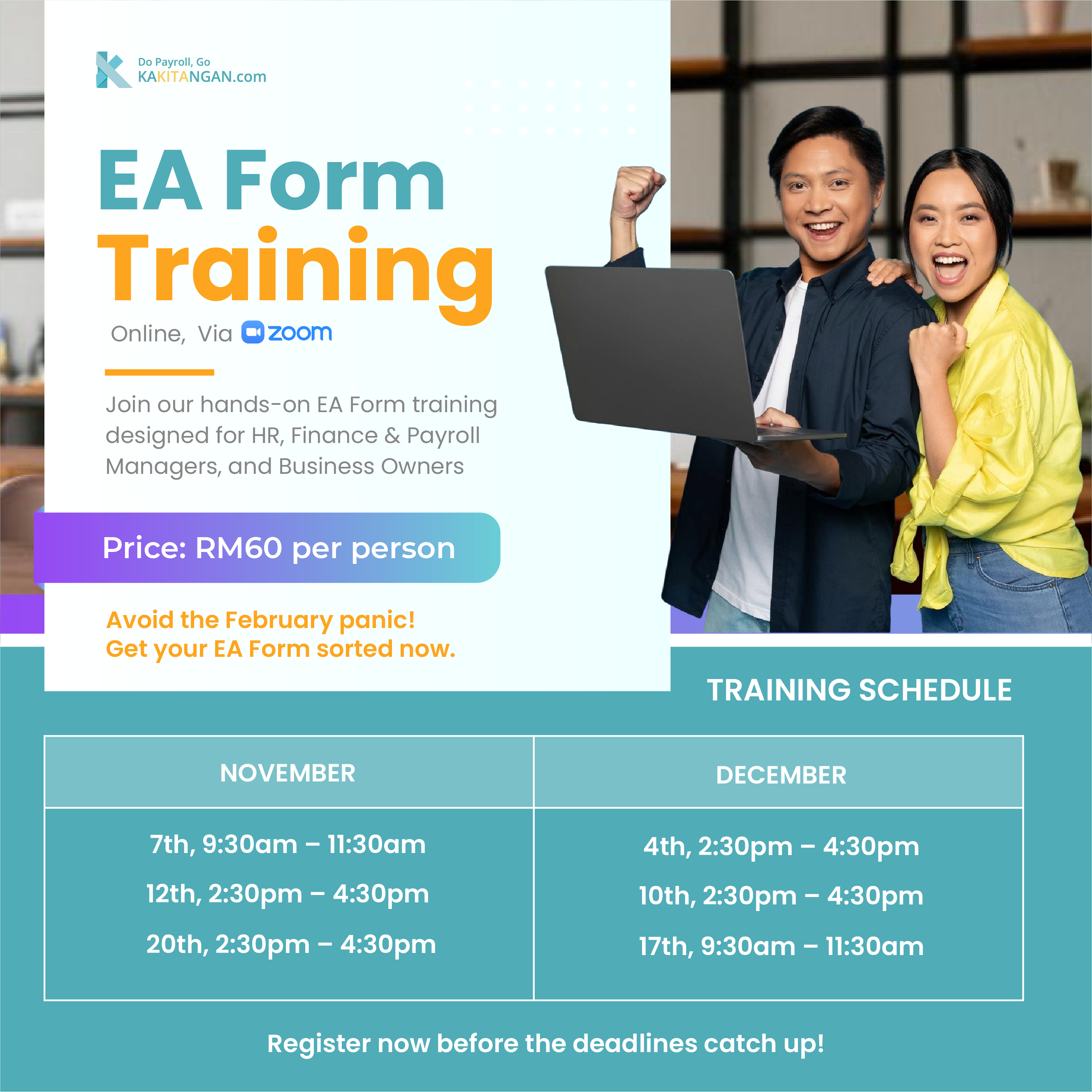 Untuk membantu anda bersedia lebih awal dan mengelakkan kesilapan yang biasa berlaku, Kakitangan.com memperkenalkan semula EA Form Training 2025; sesi latihan dalam talian yang padat dan praktikal bagi membantu HR, kewangan, dan pasukan payroll menguruskan proses EA dengan lebih lancar dan teratur.