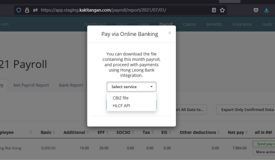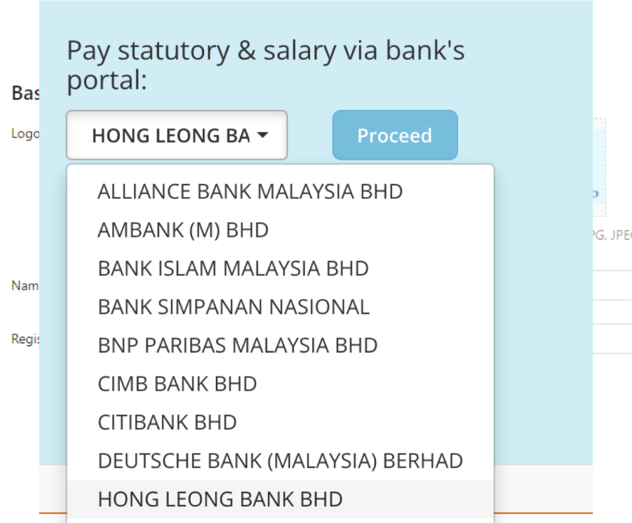 At the bottom of the page, at Pay statutory & salary via bank's portal, select Hong Leong Bank Bhd and click proceed.