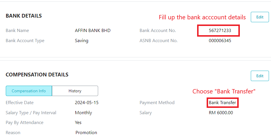 Make sure the employee details for bank account number is filled up and payment method is choose under ”Bank Transfer” under compensation.