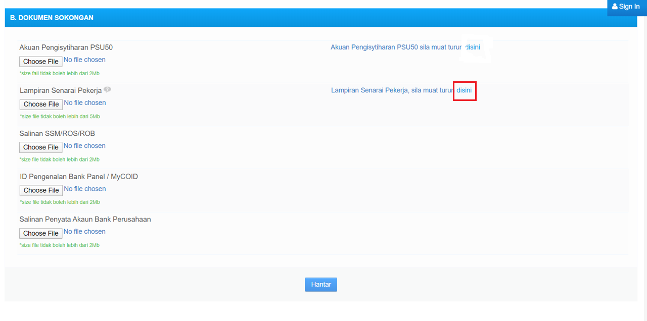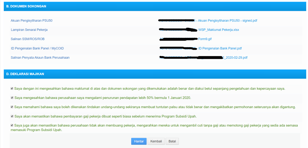 After you successfully uploaded all the required documents, check the boxes to consent and click “Hantar” to send.