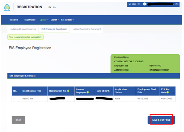 7. It will show your request completed successfully, then click Save & Continue.