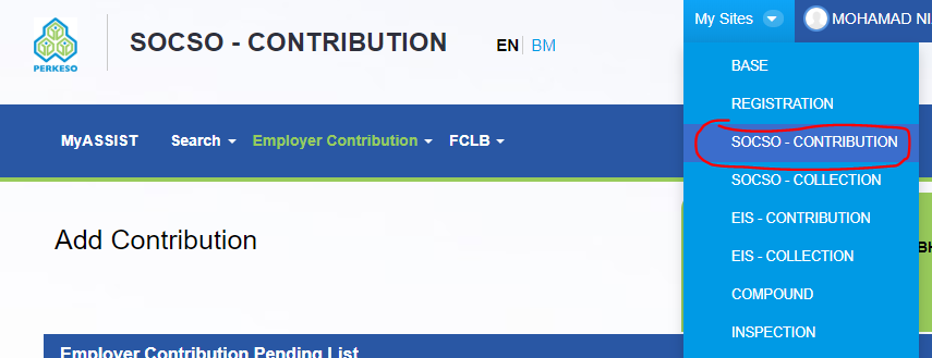 On “My Sites”, choose “SOCSO - Contribution”.