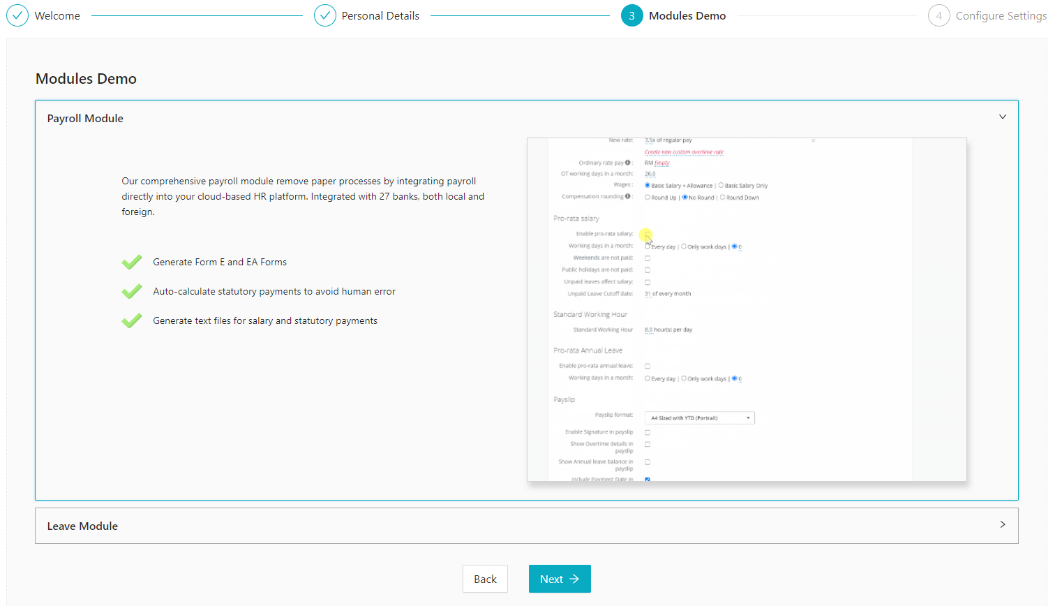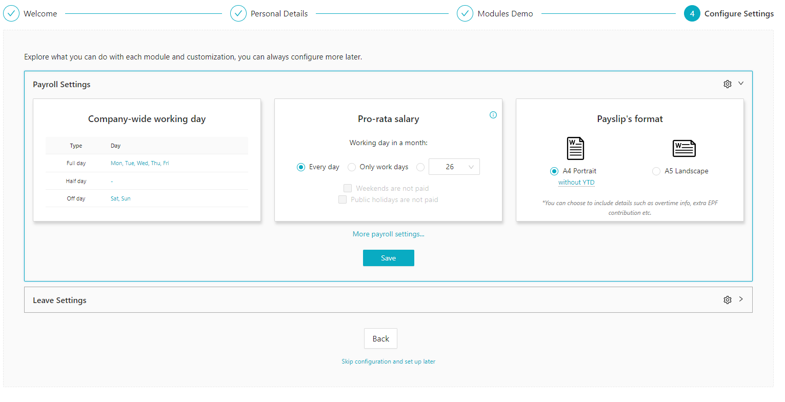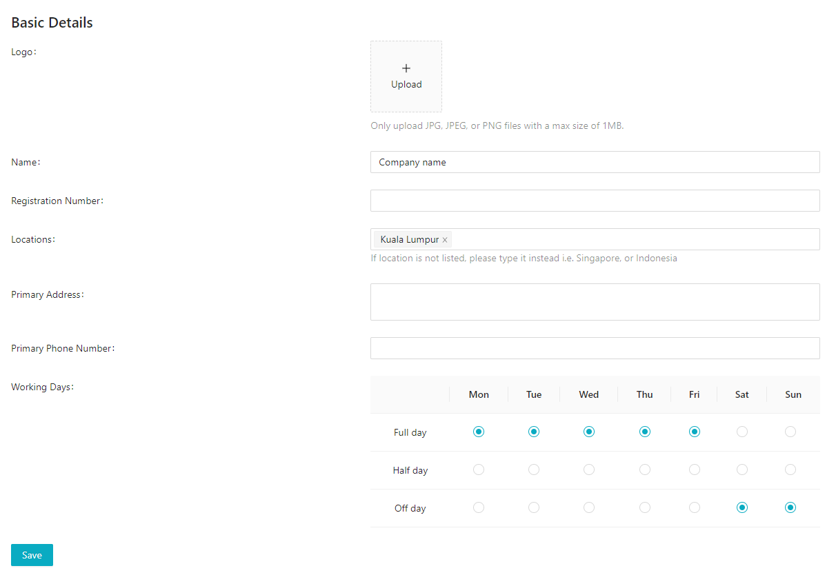 - Location(s) is for you to select the location(s) that your employees are working in. It will be used for both leave (public holidays) and payroll (pro-rated salary) purposes.