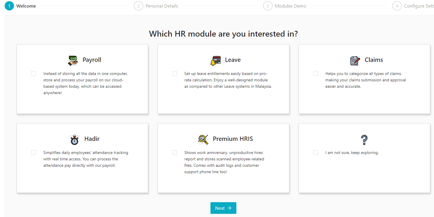 a) After you have logged in, feel free to select the modules that you are interested in and click Next!