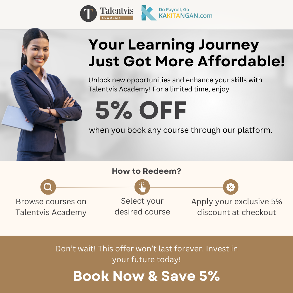 Enjoy a 5 percent discount on all Talentvis training courses when booked via Kakitangan.com. Courses include HRDF-claimable options to support your career development.