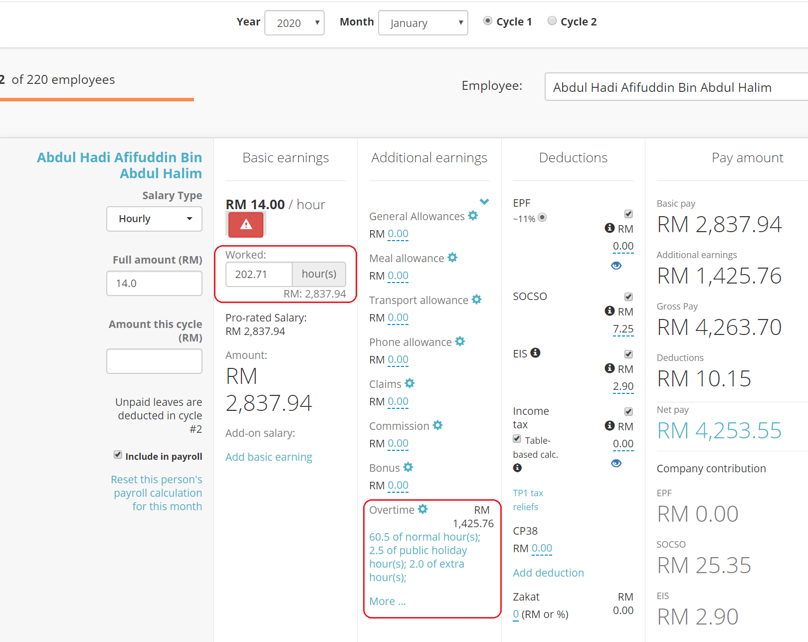 4. On your payroll calculator, you shall see those worked, OT days and amount reflected on each individual.