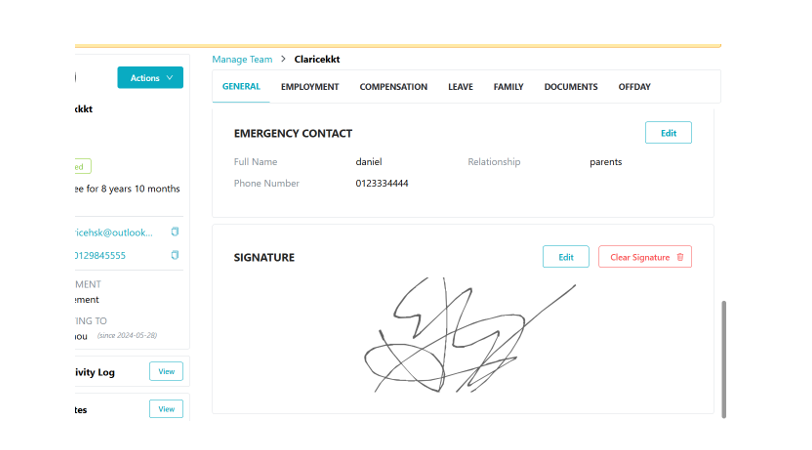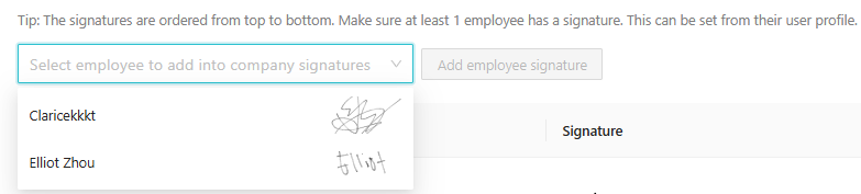 Your employees including yourself could save your signature in your profile page under General → Signature. As an administrator, you have the ability to add the specific signature as the official company signature. Additionally, please ensure that the signature used in all HR-related correspondence is consistent and appropriate.