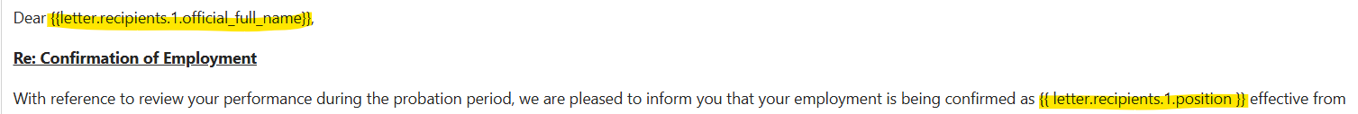 I. Some data are direct derived from your account, for instance {{letter.recipients.1.position}} = the position name under field of Position of the selected employee