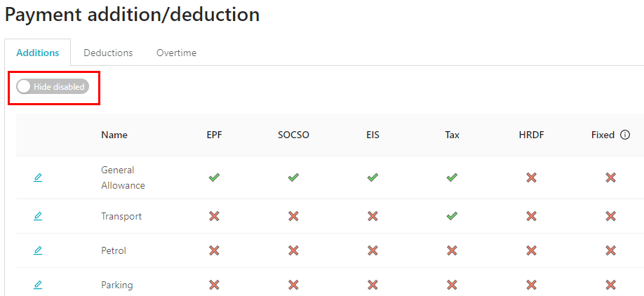6. By default, if your setting selection for wages is Basic + Allowance, the field name Include in OT pay under additions will be ticked. We offer the flexibility for users to tick and untick depending on the company practices.