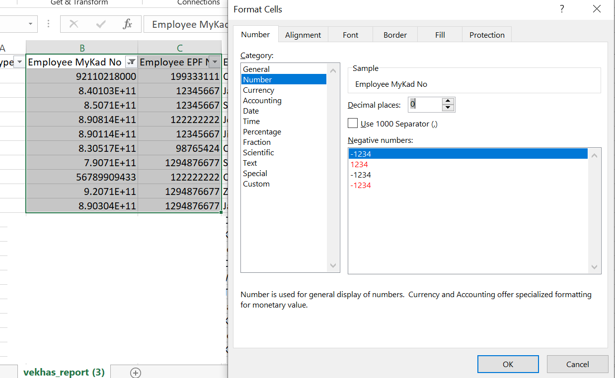 II. Now, highlight both Employee MyKad No and Employee EPF No to apply correct format > Number > Decimal places : 0 > click ok.