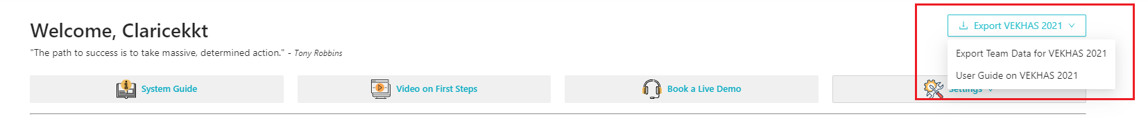 I. Click on Export Team Data for VE KHAS 2021. This file consists the required fields and data of ALL of your employees. Please double check the data in the system is correct to use.