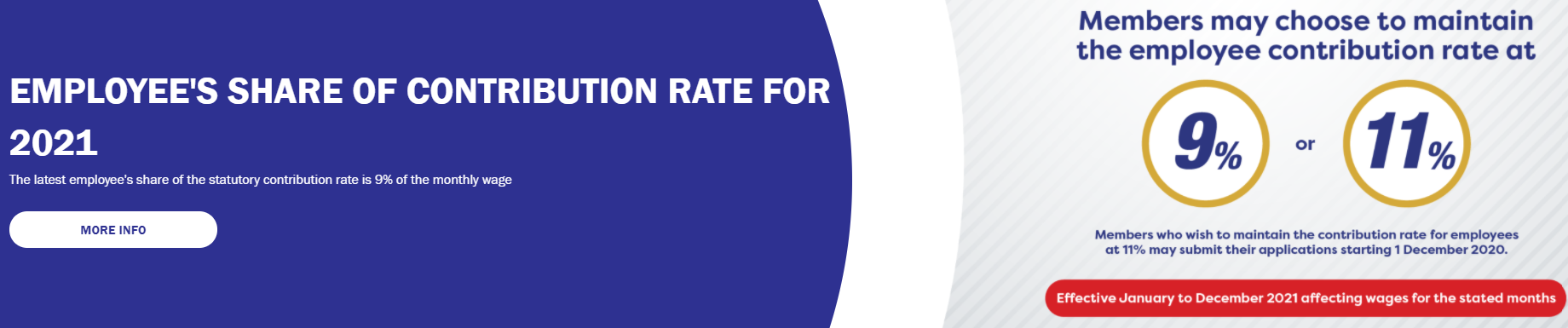 Starting for the year of 2021, the minimum statutory contribution rate for employee contributions will go down from 11% to 9%.
