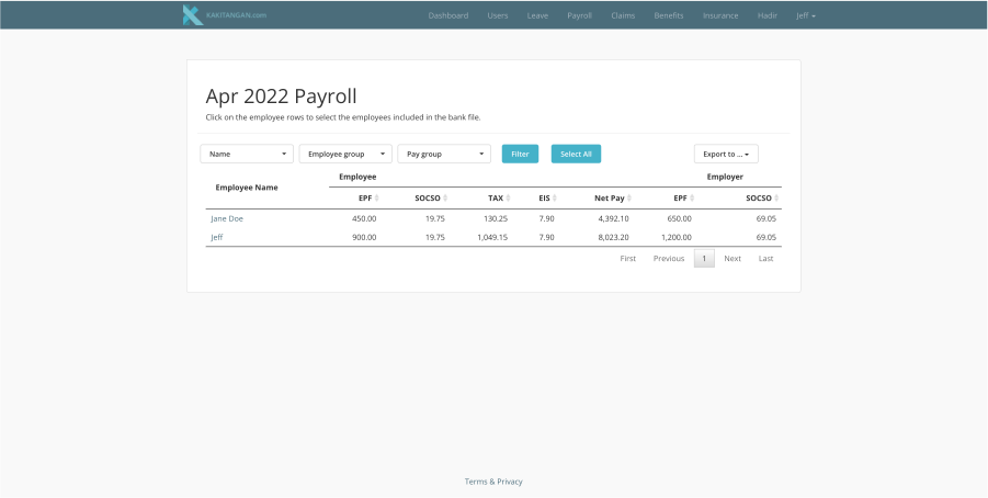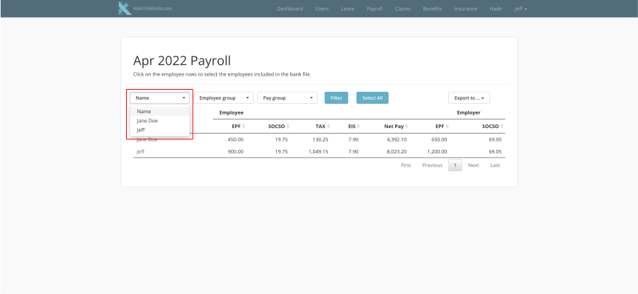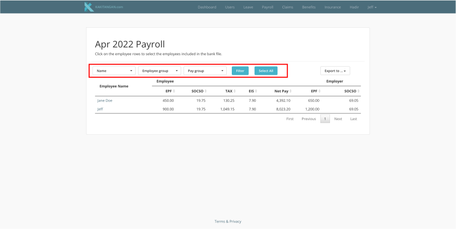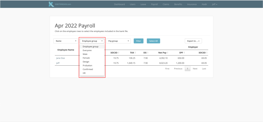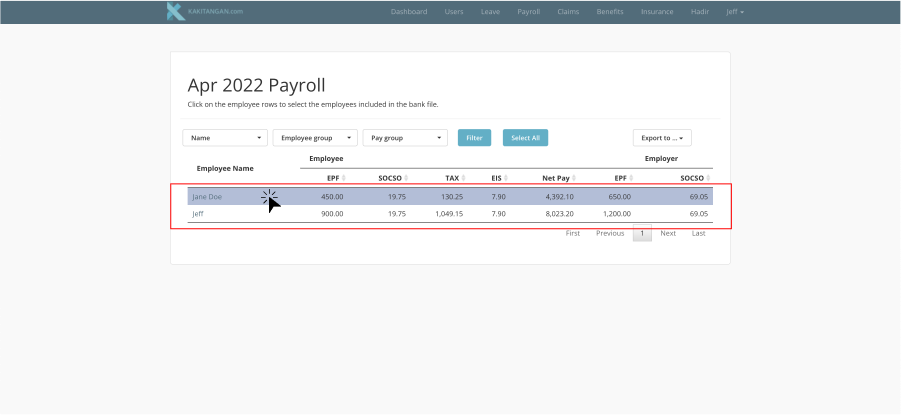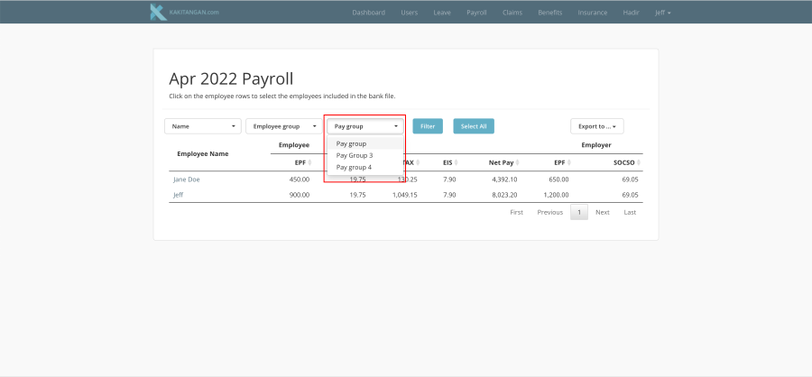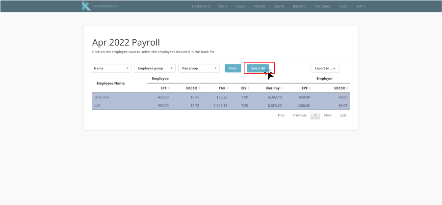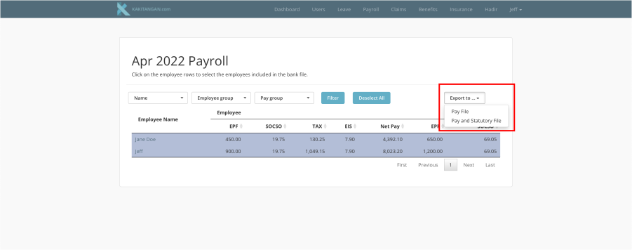 Once you have already selected the employees, you can export the data out by clicking at "Export to..." on the right and proceed to select "Pay file" or "Statutory File"