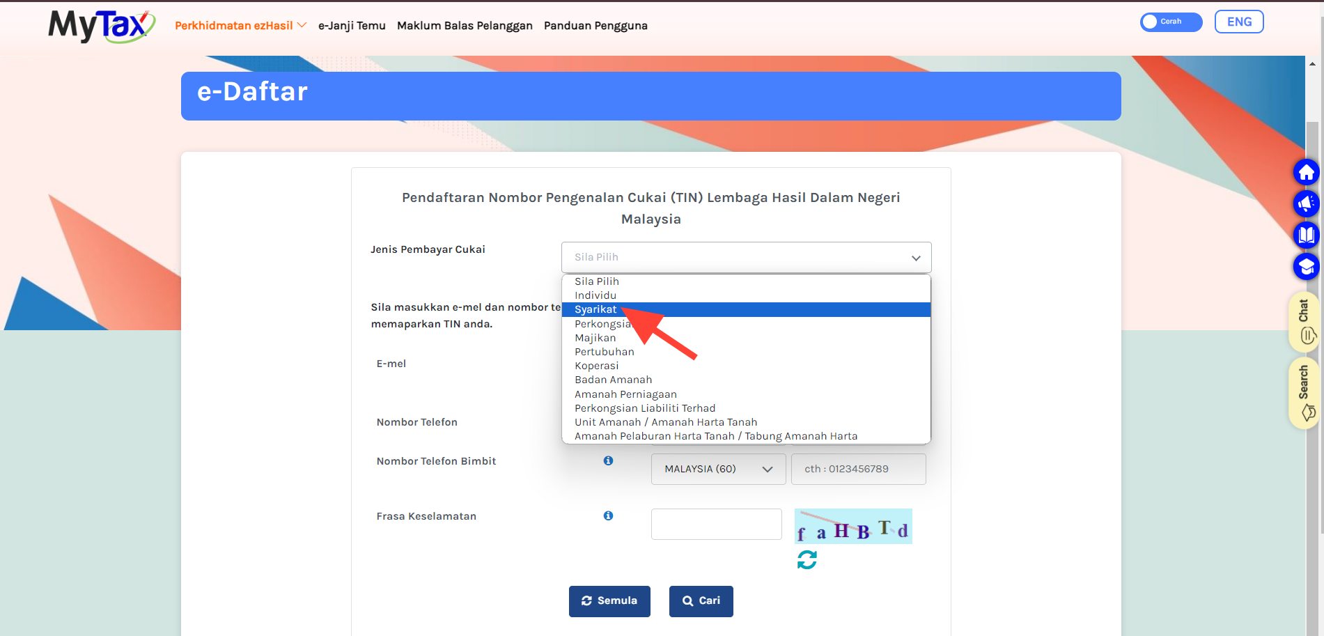 1. Klik “Jenis pembayar cukai” kemudian pilih “Syarikat”