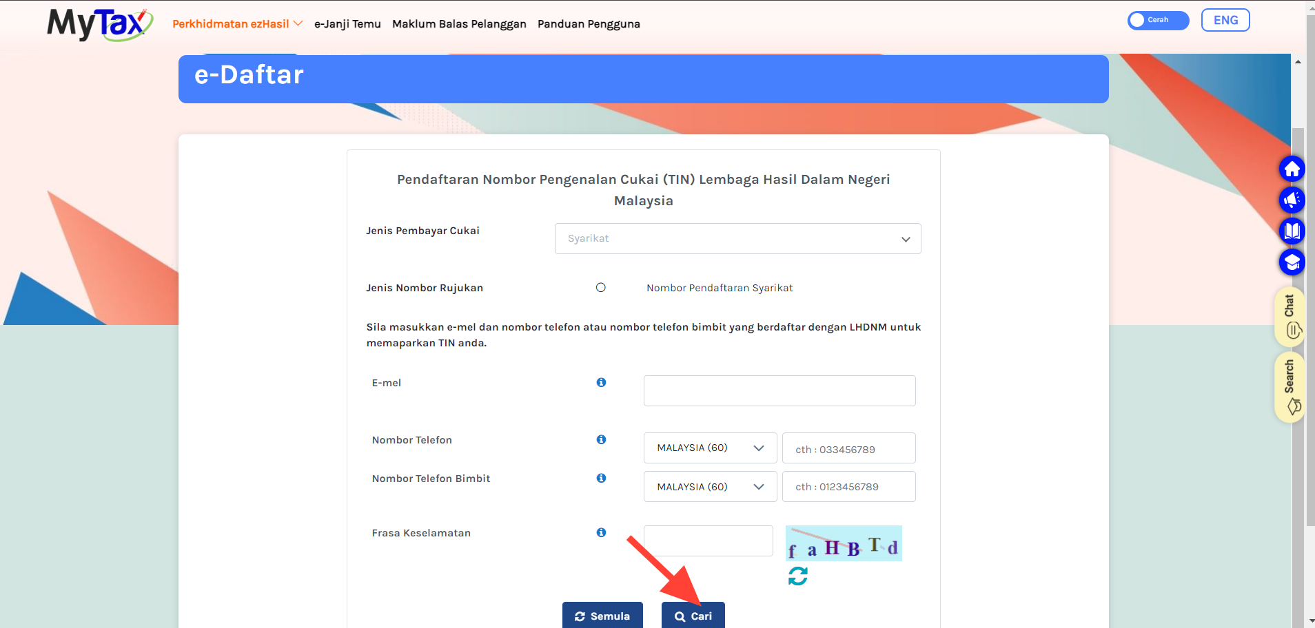 Anda boleh mendaftar di e-Daftar secara atas talian (online) di laman: - https://mytax.hasil.gov.my/ezHasil?data=e-Daftar&id=ezHasil%20sebelum