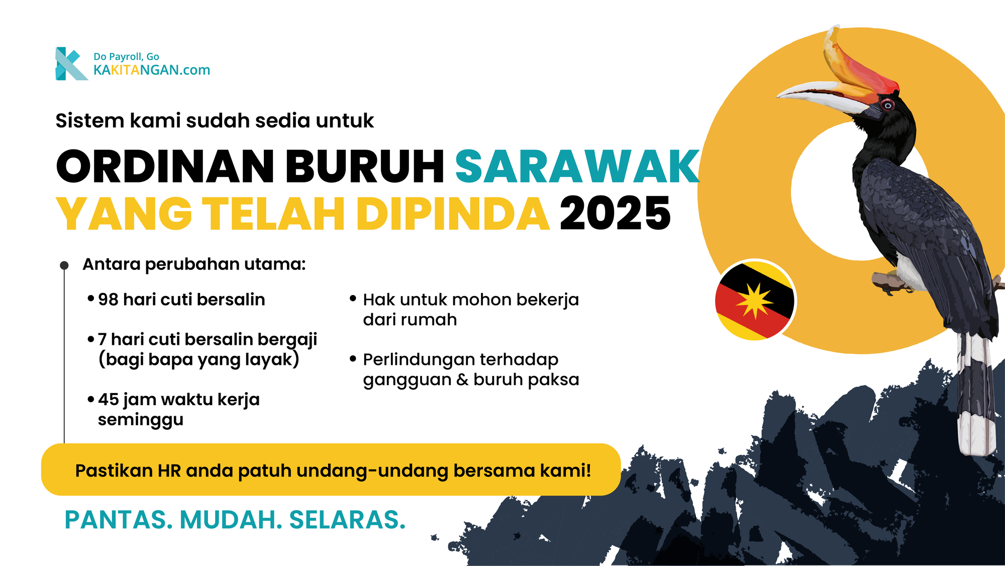 Sebagai platform HR dan gaji yang dibangunkan khusus untuk perniagaan di Malaysia, Kakitangan.com kini telah disesuaikan dengan pindaan Ordinan Buruh Sarawak 2025.
