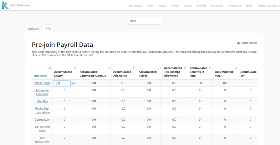 Then, click on the 2nd tab "TP3" to enter the required information. If you need to update TP3 for few employees, you may download the template by clicking "Batch Import" on top right corner.